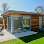 While many garden rooms feature Anthracite Grey doors and windows, this building takes a more distinctive route with light grey aluminium frames. The large sliding doors are configured to meet at a corner, creating a striking glazed corner feature that frames views across the newly landscaped garden. The aluminium corner post has been colour-matched to the frames for a streamlined finish. A solid door in the same light grey finish leads discreetly into a separate storage room, and both rooms include a small rear window positioned high for easy ventilation without interrupting the clean aesthetic.